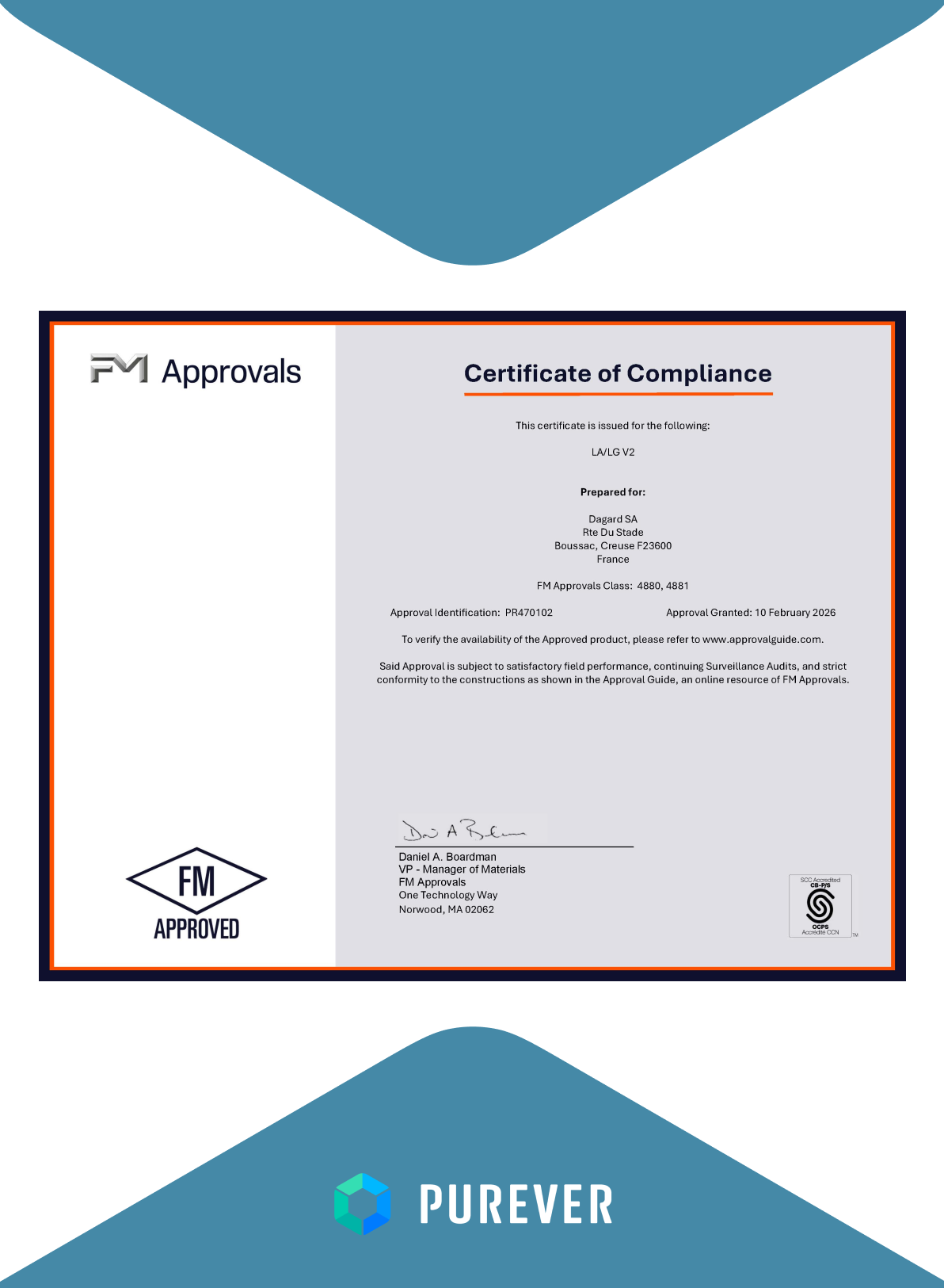 Renforcer le portefeuille de conformité internationale de Dagard L’obtention de la certification FM Approved illustre l’engagement de Dagard envers l’excellence technique, la qualité de fabrication et l’amélioration continue.