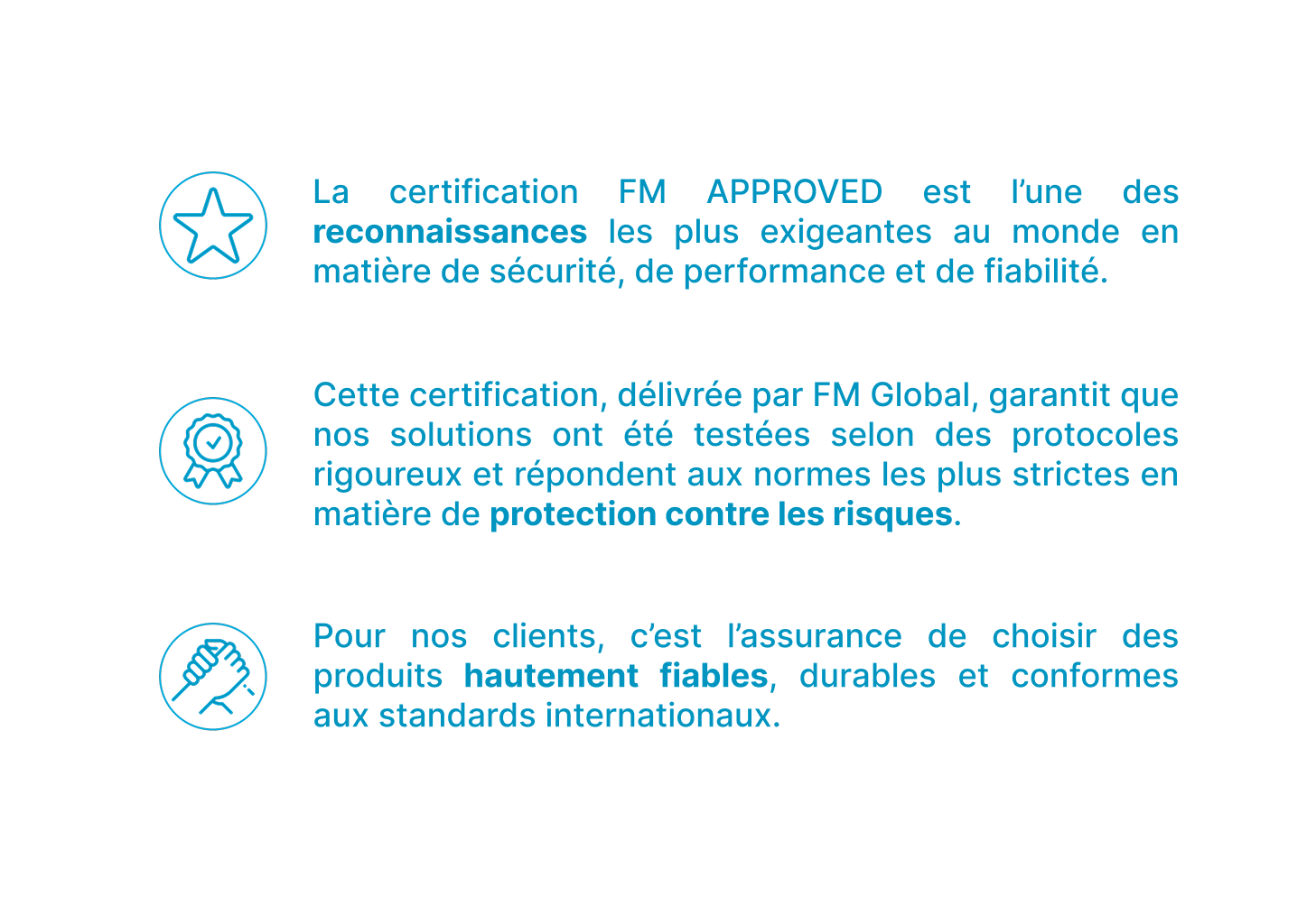 Si le marquage CE atteste de la conformité à la législation européenne, la certification FM va plus loin en validant la performance du produit dans des conditions de feu et de danger intensives.